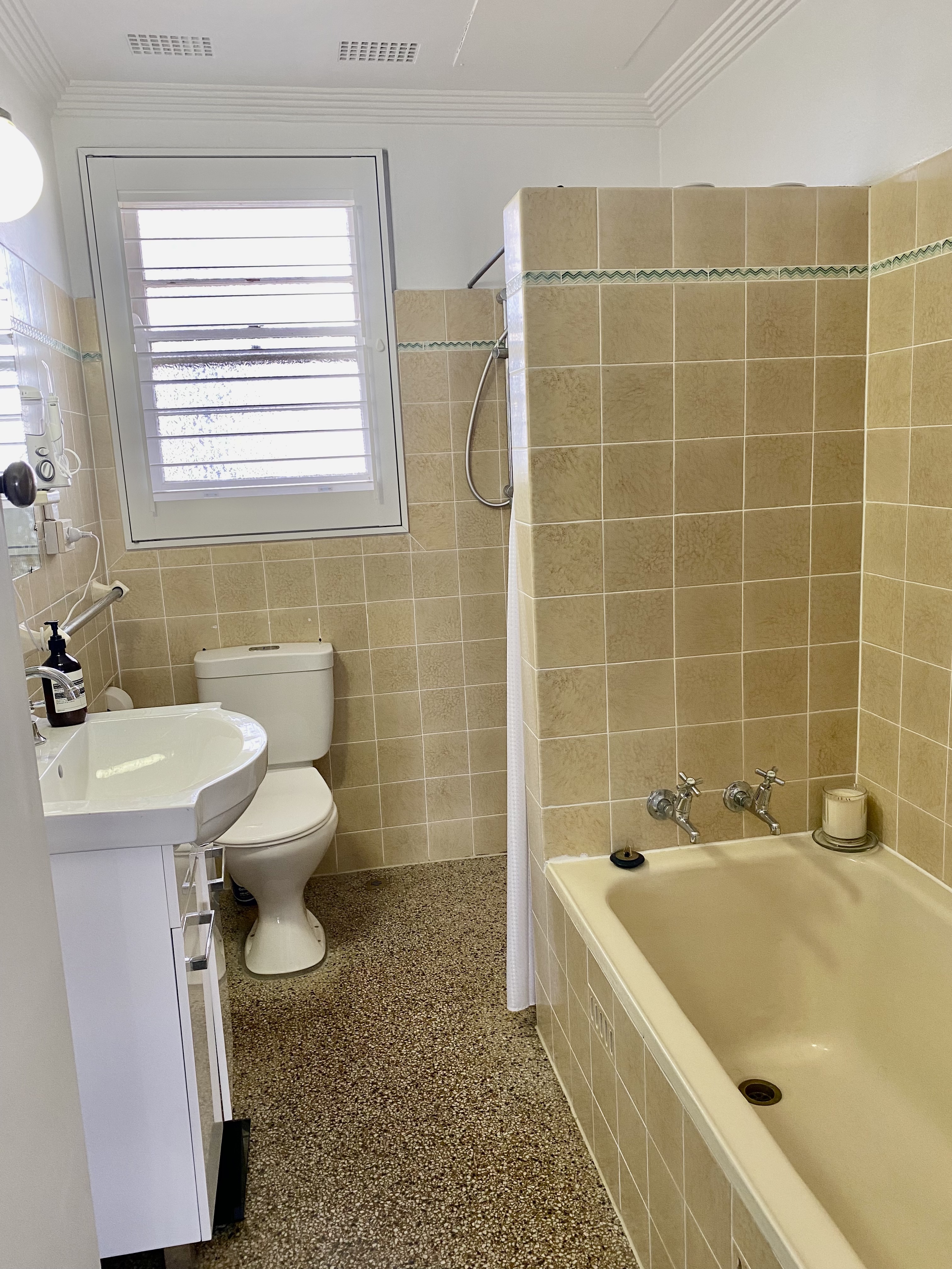 – Full-size and largely original Art Deco bathroom with separate bath and shower